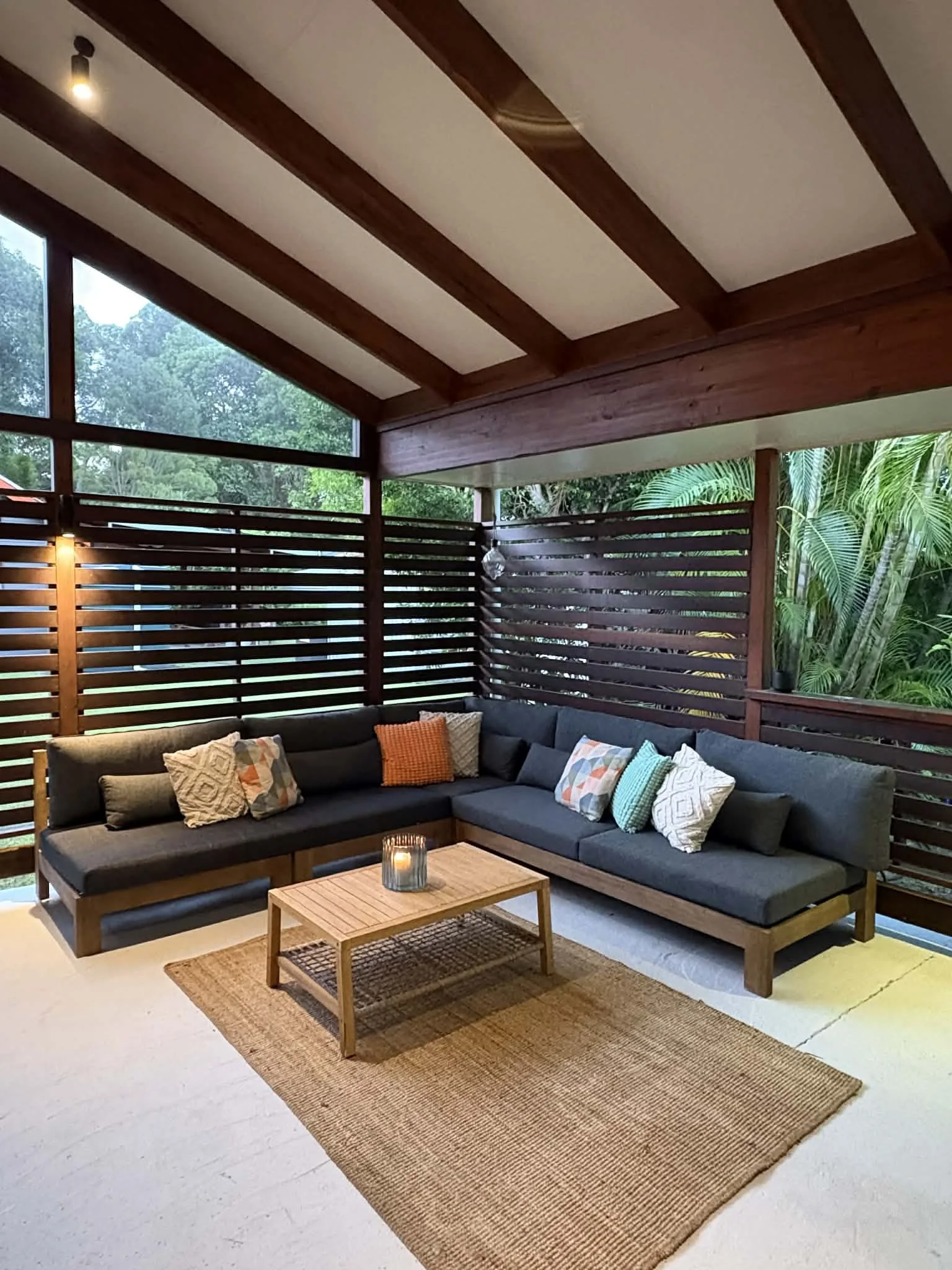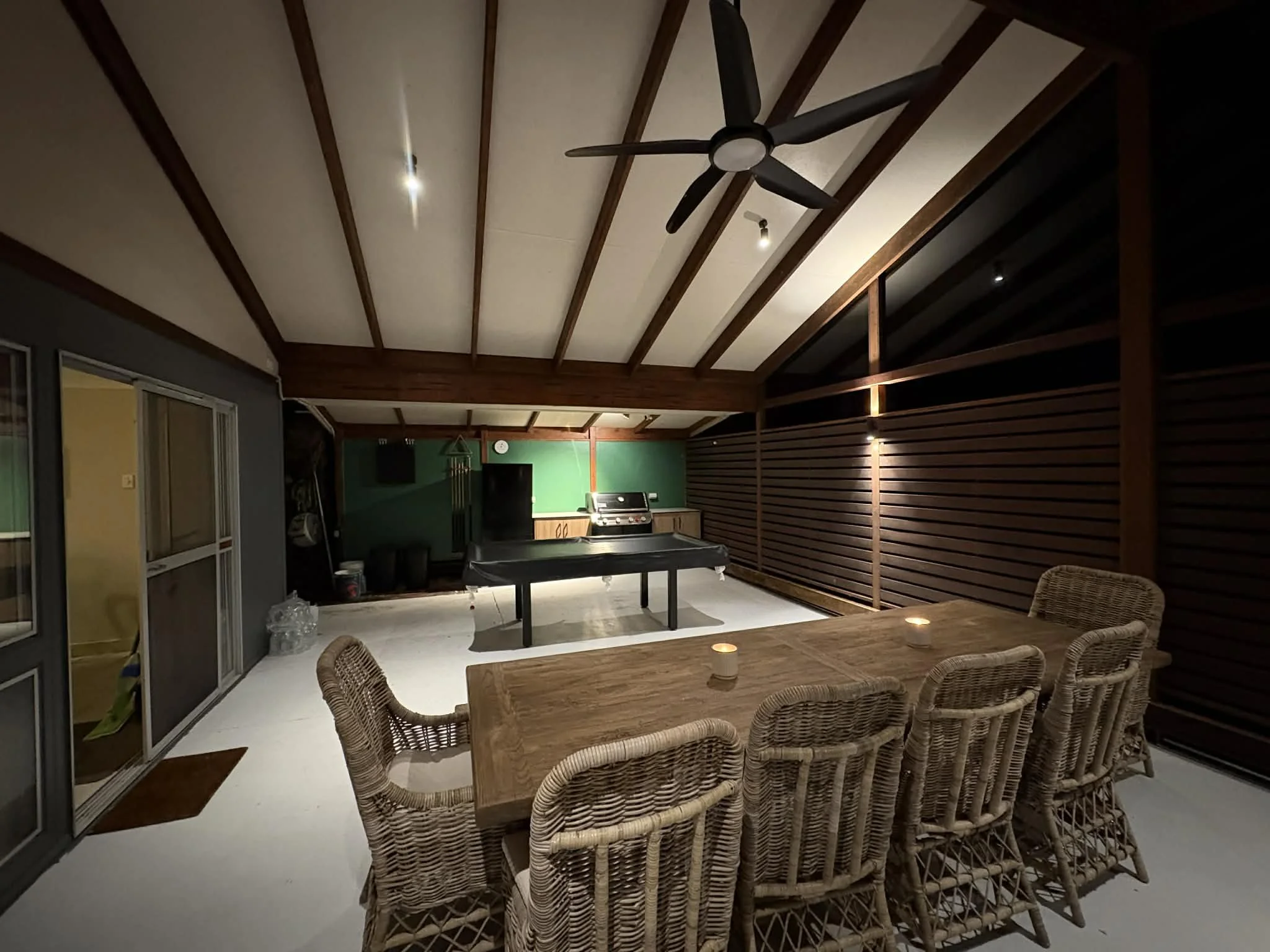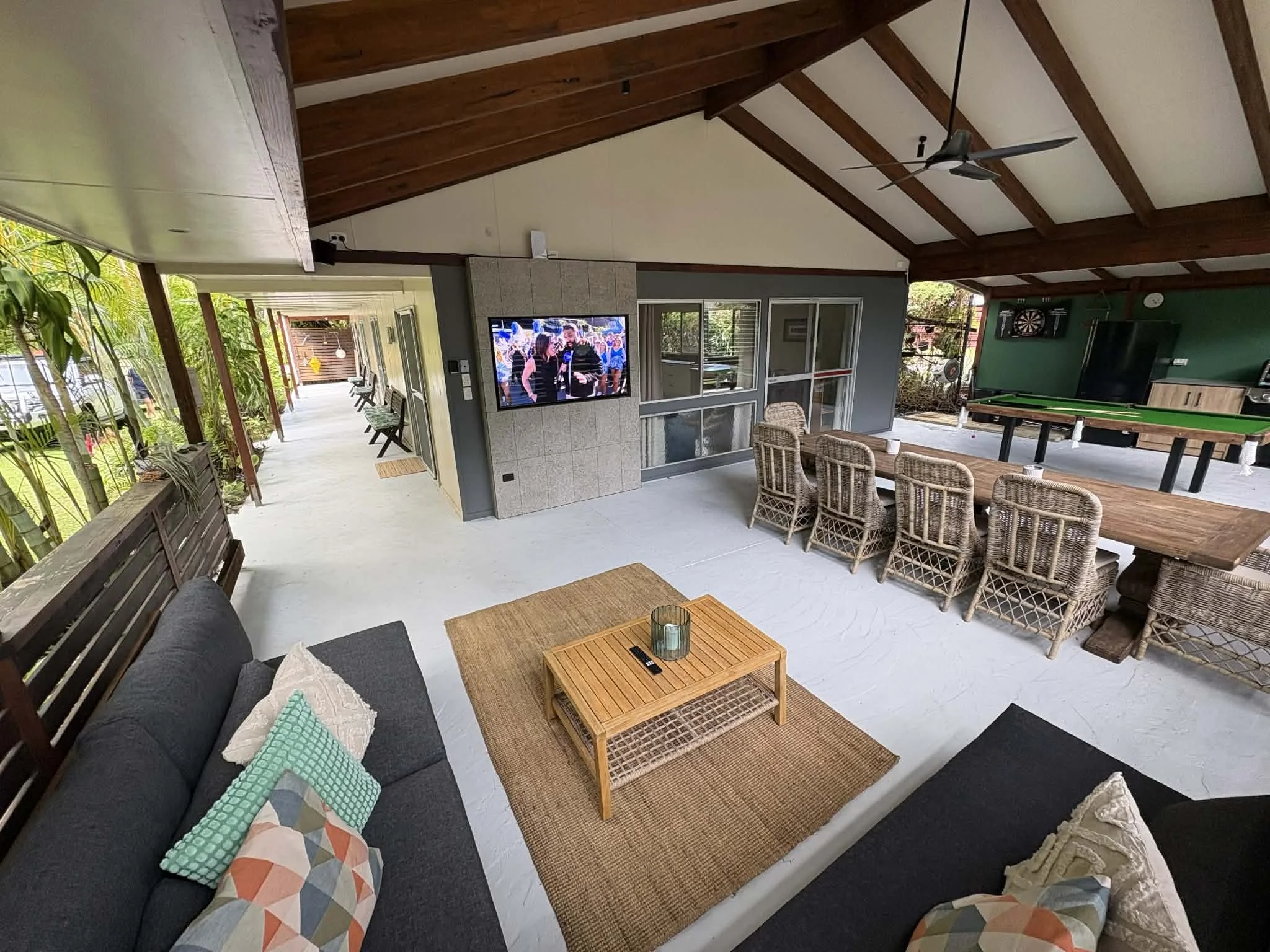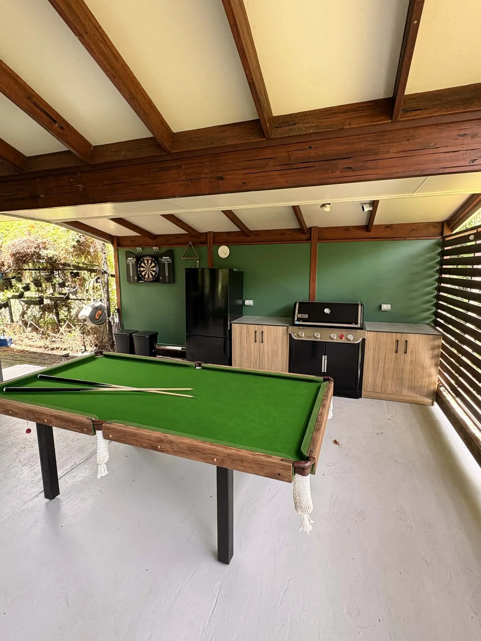 Includes a BBQ and outdoor bench area, pool table/table tennis, dart board, 10 seater dining table, large outdoor lounge and 65‘ LED TV (ideal for watching sports).
